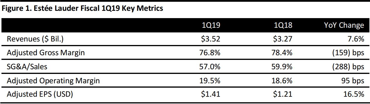 Company Earnings UpdateEstée Lauder (EL) 1Q19 Results: Company Beats Expectations and Raises Guidance Coresight Research November 5, 2018 Executive Summary Estée Lauder reported fiscal 1Q19 revenues of $3.52 billion, up 7.6% year over year and higher than the consensus estimate of $3.47 billion. Adjusted earnings per share (EPS) was $1.41, higher than the consensus estimate of $1.22 and higher than the EPS of $1.21 in the year ago period. Comparable sales were up 11% at Estée Lauder. For the second quarter, the company provided EPS guidance of $1.47–$1.50, compared to the consensus estimate of $1.63. Net sales are forecast to increase 4%–5%, compared to consensus estimate of 4.6%. For the full year, Estée Lauder raised its EPS guidance to $4.73–$4.82, up from $4.62–$4.71, compared to the consensus estimate of $4.77. The company provided revenue guidance of 4.5%, implying $12.75 billion. Please Login to read the full report. Not a member? To access this content for free, register for a free account. This document was generated for Other research you may be interested in: Shoptalk Spring 2025 “Shark Reef” Startup Pitch: Event Format and CompetitorsThree Data Points We’re Watching This Week, Week 22: US Consumer Insights—Tariffs and InflationTaking the Temperature on Tariffs Ahead of August 1: How Are Different Consumer Groups Reacting? US Consumer Survey Insights ExtraEconomic Sentiment Climbs; Walmart Overtakes Lowe’s in Home-Improvement Sector: US Consumer Survey Insights