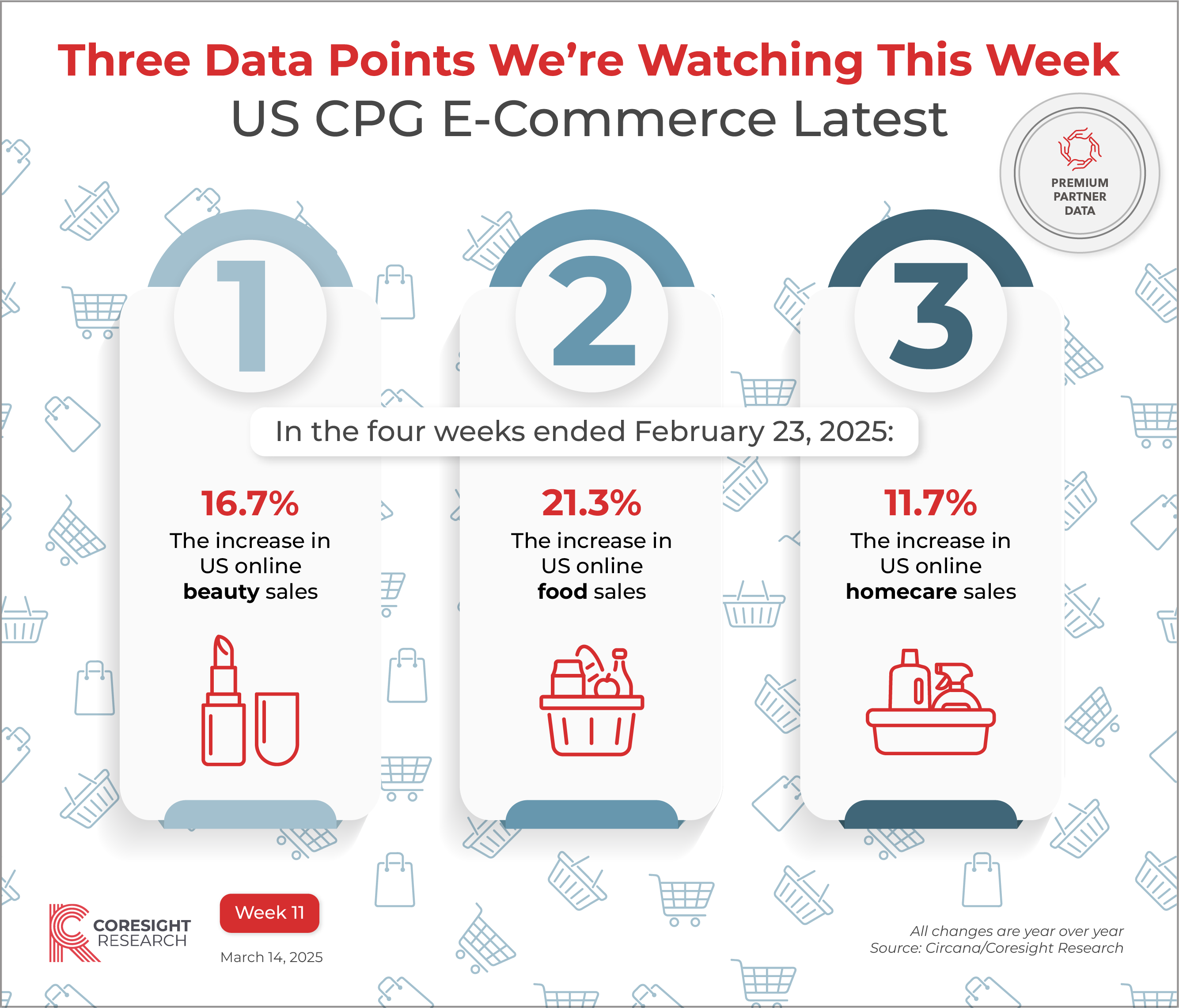 InfographicThree Data Points We’re Watching This Week, Week 11: US CPG E-Commerce Latest John Mercer, Head of Global Research and Managing Director of Data-Driven Research March 14, 2025 Reasons to ReadOur Three Data Points We’re Watching This Week series spotlights key data points from this week’s research. Discover key data points we are watching in week 11 of 2025. This week, we focus on recent CPG (consumer packaged goods) e-commerce sales performance in the US. This graphic draws on data from the latest report in the monthly US CPG Sales Tracker series, which we produce in partnership with Circana. Dive into the full research report behind these data points: US CPG Sales Tracker: E-Commerce Sales Surge, Outpacing In-Store Growth Other relevant research: Visit the Coresight Research Food, Grocery and CPG Retail Hub to explore sector data, reports and company profiles The Market Sizes Databank offers an overview of key retail market or sector sizes, including Coresight Research projections for future years. All graphics in the Three Data Points series This document was generated for Other research you may be interested in: Retail-Tech Landscape: MarTechConsumer Confidence Rebounds in October: China Consumer Survey InsightsAmazon Prime Day India 2025: Preview—Capitalizing on E-Commerce Momentum; Unlocking Small-Town Potential Through Speed and ValueGroceryshop 2025 Wrap-Up: Reinventing Grocery for an AI-Driven, Health-Focused and Value-Conscious Era