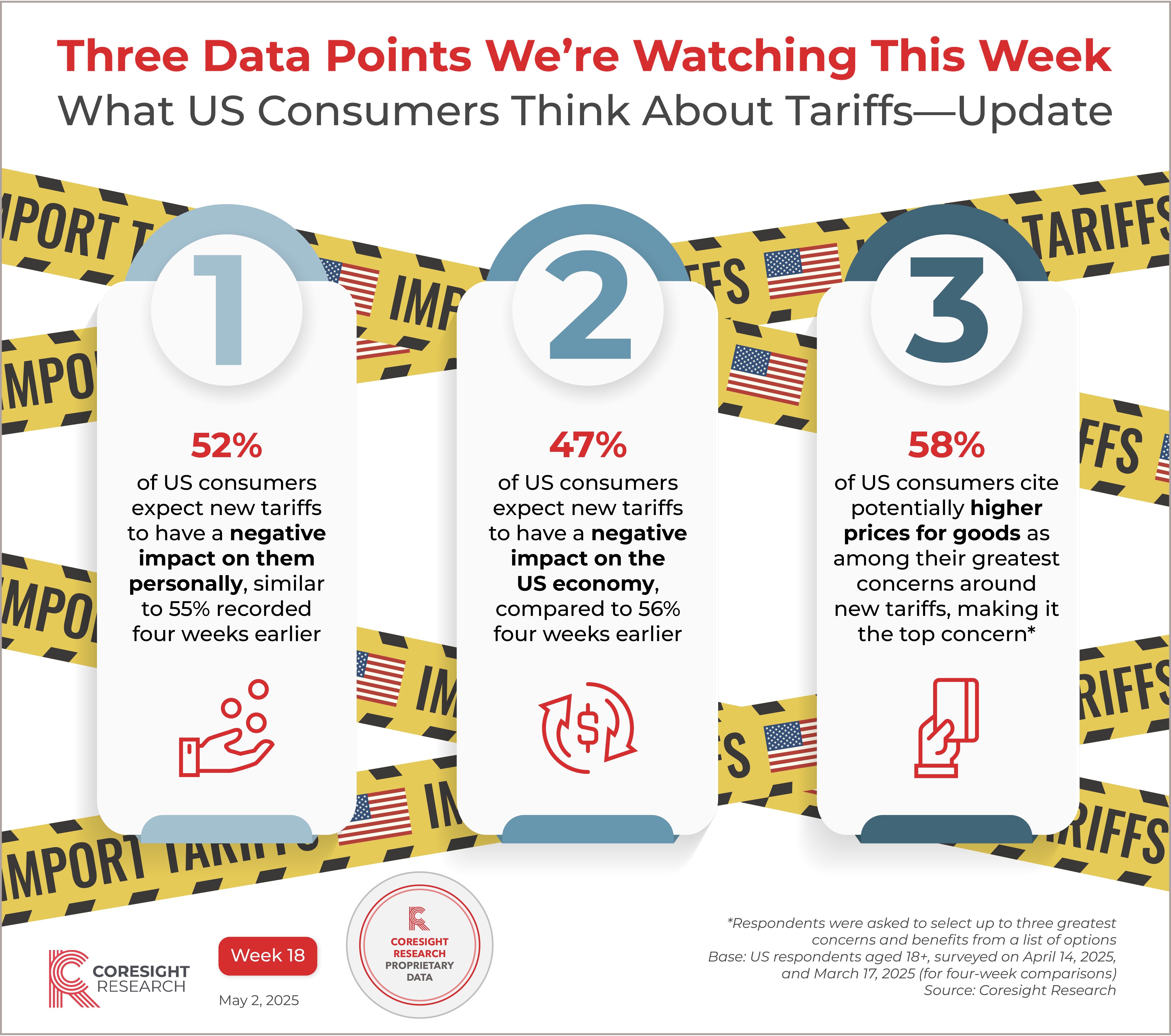 InfographicThree Data Points We’re Watching This Week, Week 18: What US Consumers Think About Tariffs—Update Coresight Research May 2, 2025 Reasons to ReadOur Three Data Points We’re Watching This Week series spotlights key data points from our research. Discover key data points we are watching in week 18 of 2025. This week, we spotlight proprietary survey findings that reveal US consumers’ expectations for the financial and economic impacts of new tariffs. Other relevant research: Tariffs + Consumer Sentiment: A Timeline, 2025 All our coverage of tariffs The Coresight Research US Consumer Survey Databank provides additional insight into US consumer behaviors from our weekly surveys. All graphics in the Three Data Points series, including our prior survey findings on consumers’ perceptions of tariffs This document was generated for Other research you may be interested in: April 2025 US Retail Sales Outlook: Lowering Near-Term Growth Projections Amid Volatility and UncertaintyWeekly US Store Openings and Closures Tracker 2025, Week 51: Retailers Announce More Than 1,000 Store Openings for 2026Sector Focus: Luxury Shopping—Data Graphic1Q25 Retail Inventory Insights: Lean Inventory, Tariff Mitigation, Supply Chain Adjustments
