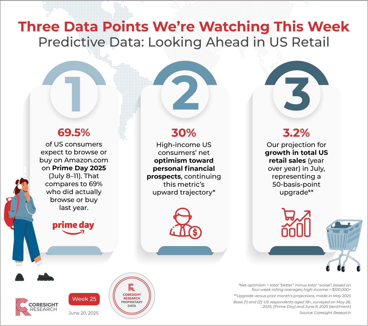 InfographicThree Data Points We’re Watching This Week, Week 25: Predictive Data—Looking Ahead in US Retail John Mercer, Head of Global Research and Managing Director of Data-Driven Research June 20, 2025 Reasons to ReadOur Three Data Points We’re Watching This Week series spotlights key data points from our research. Discover key data points we are watching in week 25 of 2025. This week, we highlight predictive US retail data, from US consumers’ Amazon Prime Day shopping plans and personal financial expectations to our proprietary sales projection for July 2025. Dive into the research behind these data points: Amazon Prime Day 2025: Preview—Five Essential Insights on Consumers’ Shopping Plans Financial Confidence Improves but Tariffs and Inflation Impact Shopping Behavior: US Consumer Survey Insights Look out for our upcoming US Retail Sales Outlook report for new, proprietary projections Other relevant research: The Coresight Research US Consumer Survey Databank provides additional insight into US consumer behaviors from our weekly surveys. All graphics in the Three Data Points series This document was generated for Other research you may be interested in: Store Tracker Extra: US Store Openings and Closures 2024 Review and 2025 OutlookFebruary 2025 US Retail Sales: First Year-Over-Year Drop Since the Pandemic—Electronics and Department Stores Lead DeclinesWeekly US Store Openings and Closures Tracker 2025, Week 15: Guess? To Close Nearly 20 StoresKeeping Green While Saving Green: Five Areas for Technology-Driven Sustainability in 2025
