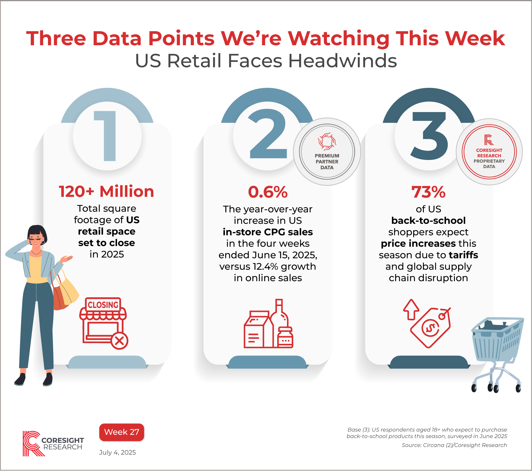 InfographicThree Data Points We’re Watching This Week, Week 27: US Retail Faces Headwinds Georgina Smith, Head of Editorial July 4, 2025 Reasons to ReadOur Three Data Points We’re Watching This Week series spotlights key data points from our research. Discover key data points we are watching in week 27 of 2025. This week, we highlight headwinds for US retail, covering store closures, decelerating in-store CPG sales and consumers’ price sensitivity amid tariffs. Dive into the research behind these data points: US Store Tracker Extra, June 2025: 120+ Million Square Feet of Retail Space To Close This Year, Outpacing Openings by Over 1.5X US CPG Sales Tracker: E-Commerce Sustains Double-Digit Growth Rate; In-Store Sales Expansion Slows US Back to School 2025: Early Shopping, Tariff Worries and Strategic Choices Shape BTS 2025 Other relevant research: View our full collection of store tracker reports, covering the UK, the US and Canada. All our coverage of tariffs Visit the Coresight Research Food, Grocery and CPG Retail Hub to explore sector data, reports and company profiles. The Coresight Research US Consumer Survey Databank provides additional insight into US consumer behaviors from our weekly surveys. All graphics in the Three Data Points series This document was generated for Other research you may be interested in: Canada Store Openings and Closures Tracker 2025: Best Buy, Dollarama and Loblaw Companies Lead Openings at the Start of the YearWeekly US Store Openings and Closures Tracker 2025, Week 37: YTD Retail Bankruptcies Hit 25Innovator Matrix: MarTechSycamore Partners To Acquire Walgreens Boots Alliance—Exploring the Reasons for and Implications of the $23.7 Billion Deal