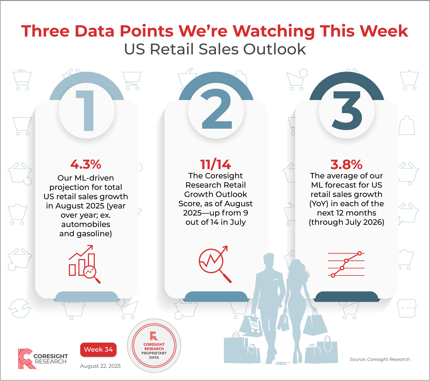 InfographicThree Data Points We’re Watching This Week, Week 34: US Retail Sales Outlook John Mercer, Head of Global Research and Managing Director of Data-Driven Research August 22, 2025 Reasons to ReadOur Three Data Points We’re Watching This Week series spotlights key data points from our research. Discover selected data insights from Coresight Research. This week, the US retail outlook. Dive into the research behind these data points: August 2025 US Retail Sales Outlook: July Strength and Improved Outlook Score Raise Retail Projection Above 4% Other relevant research: The US Retail Sales Databank All graphics in the Three Data Points series This document was generated for Other research you may be interested in: Analyst Corner: US Consumer Sentiment Varies by Age and Income—Uncovering Demographic Trends, with Aditya KaushikEarnings Insights 1Q25, Week 5: BJ’s Wholesale Club and Home Depot Report Sales Growth; Target Reports Sales Decline—InfographicThree Data Points We’re Watching This Week, Week 21: US Retail and Consumer DevelopmentsConsumer Sentiment Flatlines Ahead of Big Tariff Reveal; Plus, Mass Merchandisers and Wholesale Clubs in Focus: US Consumer Survey Insights