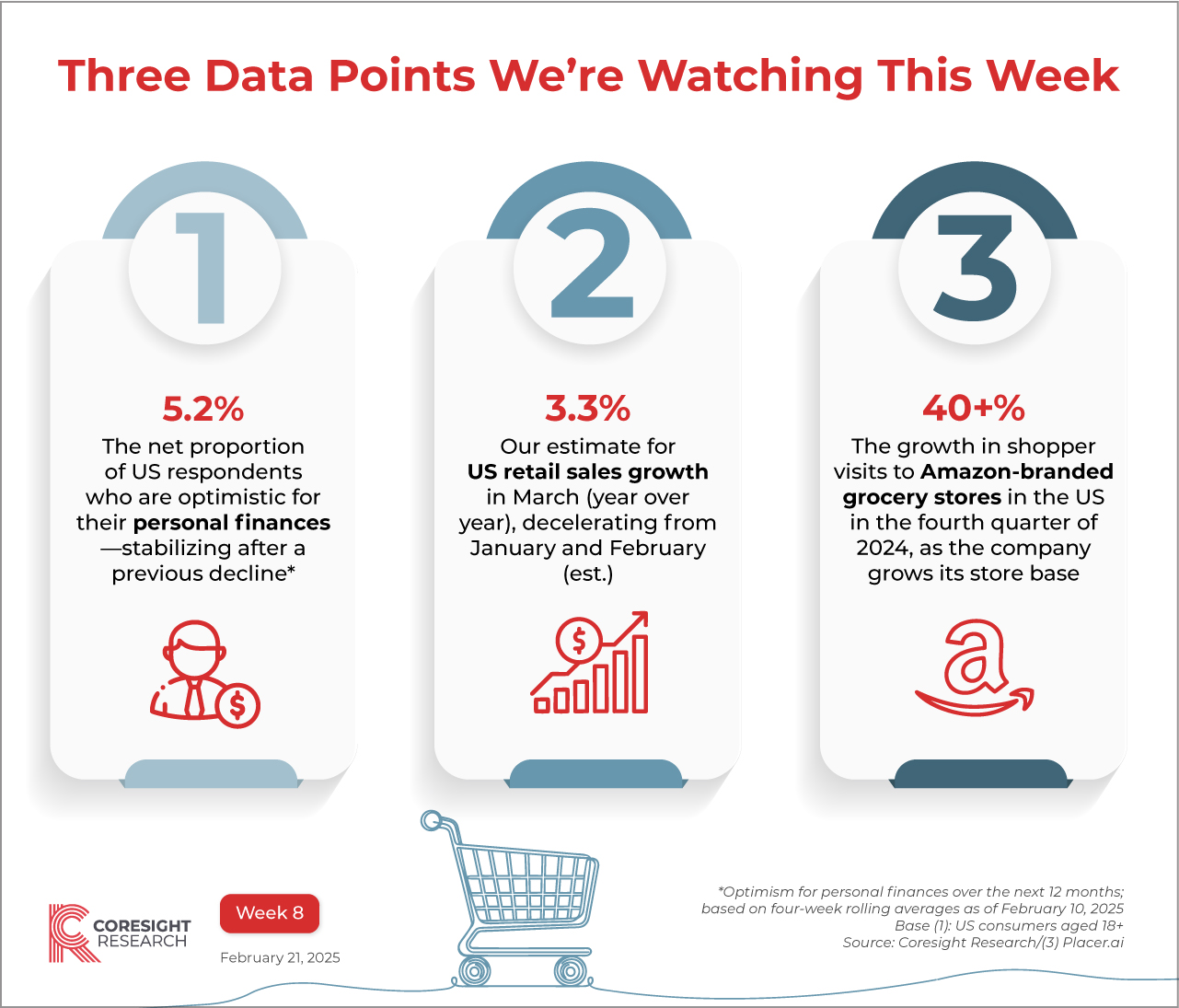 InfographicThree Data Points We’re Watching This Week, Week 8 John Mercer, Head of Global Research and Managing Director of Data-Driven Research February 21, 2025 Reasons to ReadOur Three Data Points We’re Watching This Week series spotlights key data points from this week’s research. From US consumer sentiment and retail sales to grocery store traffic for Amazon, discover key data points we are watching in week 8 of 2025. Dive into the full research reports behind these data points: Department Stores in Focus; Plus, Consumer Sentiment Latest: US Consumer Survey Insights February 2025 US Retail Sales Outlook Grocery Retailing—US Real Estate Insights Other relevant research: The Coresight Research US Consumer Survey Databank provides additional insight into US consumer behaviors from our weekly surveys. Our monthly reports keep you up to date on retail sales (in total and by sector) and key consumer indicators in the US. Visit the Coresight Research Food, Grocery and CPG Retail Hub to explore sector data, reports and company profiles. All graphics in the Three Data Points series This document was generated for Other research you may be interested in: Higher- and Lower-Income Consumers Drive Financial Optimism to Four-Month High: US Consumer Survey InsightsThe Changing Consumer: Insights Presented by Deborah Weinswig at YPO Retail CEO SummitUS Consumer Sentiment Amid the Energy Shock: Premium Subscriber CallHigh-Income Consumers’ Financial Sentiment Reaches New Peak; Facebook Slumps in Social Commerce: US Consumer Survey Insights