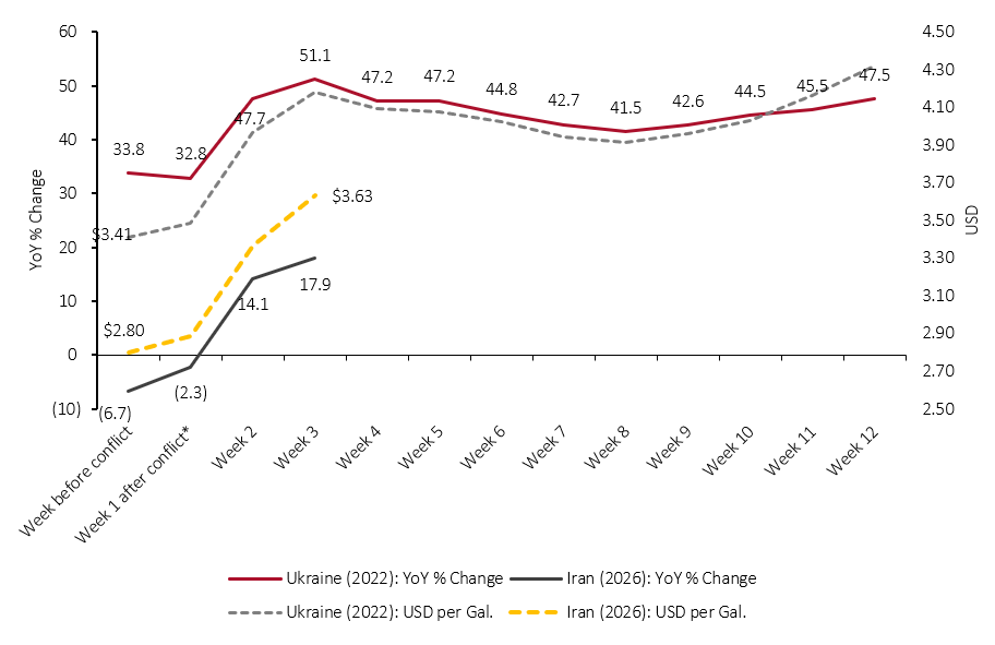 Insight ReportUS Consumer Sentiment Amid the Middle East Energy Shock John Mercer, Head of Global Research and Managing Director of Data-Driven Research March 16, 2026 Reasons to ReadRead this report to understand our latest data and analysis on the implications of the Iran/Middle East energy shock, with a focus on the US consumer and retail. How is US consumer financial and economic sentiment trending, in total and for different income groups? How do gasoline price rises compare to those following the start of the 2022 Ukraine conflict? What are the learnings around shopper traffic from 2022? How much would rising gasoline prices cost US consumers and what is one potential multibillion-dollar offset for higher gasoline prices? Related Reports: CEO Brief: Iran Energy Shock—US Consumer Economy and Retail Impacts Executive SummaryUS consumer sentiment is falling amid the Middle East energy shock. Gasoline prices will impact lower-income consumers first, both directly and indirectly (through the cost of retail products). A strong tax-refund season is one counterbalance, as tens of billions of dollars (additional to last year) are likely to be pumped into the consumer economy. Coresight Research Analysis Consumer Sentiment Is Sliding Personal financial sentiment and economic sentiment are both trending downward, according to our weekly index. Financial sentiment began its decline shortly before the conflict in Iran began. By income group, the decline in sentiment began earliest among lower-income consumers. This group has since been followed by the middle- and higher-income groups. Lower-income consumers are more exposed and sensitive to inflation in everyday categories such as gasoline and groceries. We would expect the ripple effects of higher gasoline prices to show up early in groceries, given the frequently replenished nature of the category. Energy Shock Consumer Impacts As of March 13, gasoline prices had risen by 17.9% year over year. The shape of change in absolute prices (USD) and the year-over-year percentage change is very similar to that seen after the Ukraine invasion four years earlier. However, gasoline inflation and prices are both starting from a lower level than in 2022. Post-Ukraine, the rate of inflation stopped increasing after week 3, but it remained highly elevated, at 40+% year over year. Looking back at 2022, we saw a slowdown in the pace of growth in visits to retail stores, after the Ukraine conflict began and gasoline inflation accelerated. Tax refunds will provide consumers, in total, with a buffer against higher gasoline prices. We expect total refunds for 2026 to increase by around $31-$33 billion versus 2025. That compares to typical monthly consumer spending on gasoline of $31 billion. If, in theory, gasoline prices rise by about 20% year over year, it would cost consumers an extra $6.3 billion per month. In theory, the increased amount in tax refunds could fund that for just over five months. What We Think Uncertainty is the new certainty, and the Middle East energy shock is likely only to entrench existing macroeconomic trends. Assuming the energy shock is not entirely transient, we expect oil price spikes and gasoline price rises to have the following effects: Strengthening overall inflation, due to gasoline prices having a multiplier effect through the economy. We expect 2026 to be the sixth consecutive year of average >2% yearly CPI. Upward pressure on food prices: Products with a short shelf-life will be the first to feel the impacts of the energy spike. “K-shaped” economy: We expect higher-income consumers to again drive growth as lower-income consumers are more heavily impacted by inflation in essentials such as gasoline ad groceries. However, there is a downside risk for higher earners’ spending, as stock-market volatility will hit more affluent consumers’ propensity to spend. Should store traffic tighten, retailers should fight to remain in their shopper’s consideration set, by giving shoppers reasons to visit stores, and retargeting shoppers to drive online purchases. Retailers should not overlook the store fundamentals in discretionary retail, such as in-store execution. For example, Macy’s is driving comp expansion in those stores that focus on execution in merchandising, service and replenishment. Across all recent macroeconomic uncertainties—from Covid-19 to tariffs to the energy shock—diversified supply chains remain an underlying strategy for resilience. In a tougher demand-side market, retailers should explore margin-expansion opportunities, including with technology (including AI) for productivity, and intelligent inventory management. We believe that this conflict and the energy shock only add greater urgency to solutions that focus on margins as well as sales. If “uncertainty is the new certainty,” we continue to emphasize opportunities in rethinking the role of the store, deploying agentic AI for productivity and tapping alternative revenue streams. Introduction We discuss US consumer sentiment, potential shopper reactions and implications for retailers amid the Middle East energy shock. This report is based on our Premium Subscriber Call of March 13, 2026. US Consumer Sentiment Amid the Middle East Energy Shock: Coresight Research Analysis 1. Consumer Sentiment Is Sliding We track US consumer sentiment weekly on two separate measures—personal financial expectations and wider economic expectations, both over the next 12 months. As shown in Figure 1, which gives a 12-month view, both are now trending downward, although financial expectations began its slide before the Iran conflict began in February. Prior to February, financial sentiment had generally been improving, following the end of the federal government shutdown. Figure 1. US Survey Respondents: Expectations for Their Household Financial Situation/the Economy to Get Better or Worse Over the Next 12 Months—Net Better (% of Respondents, Four-Week Rolling A